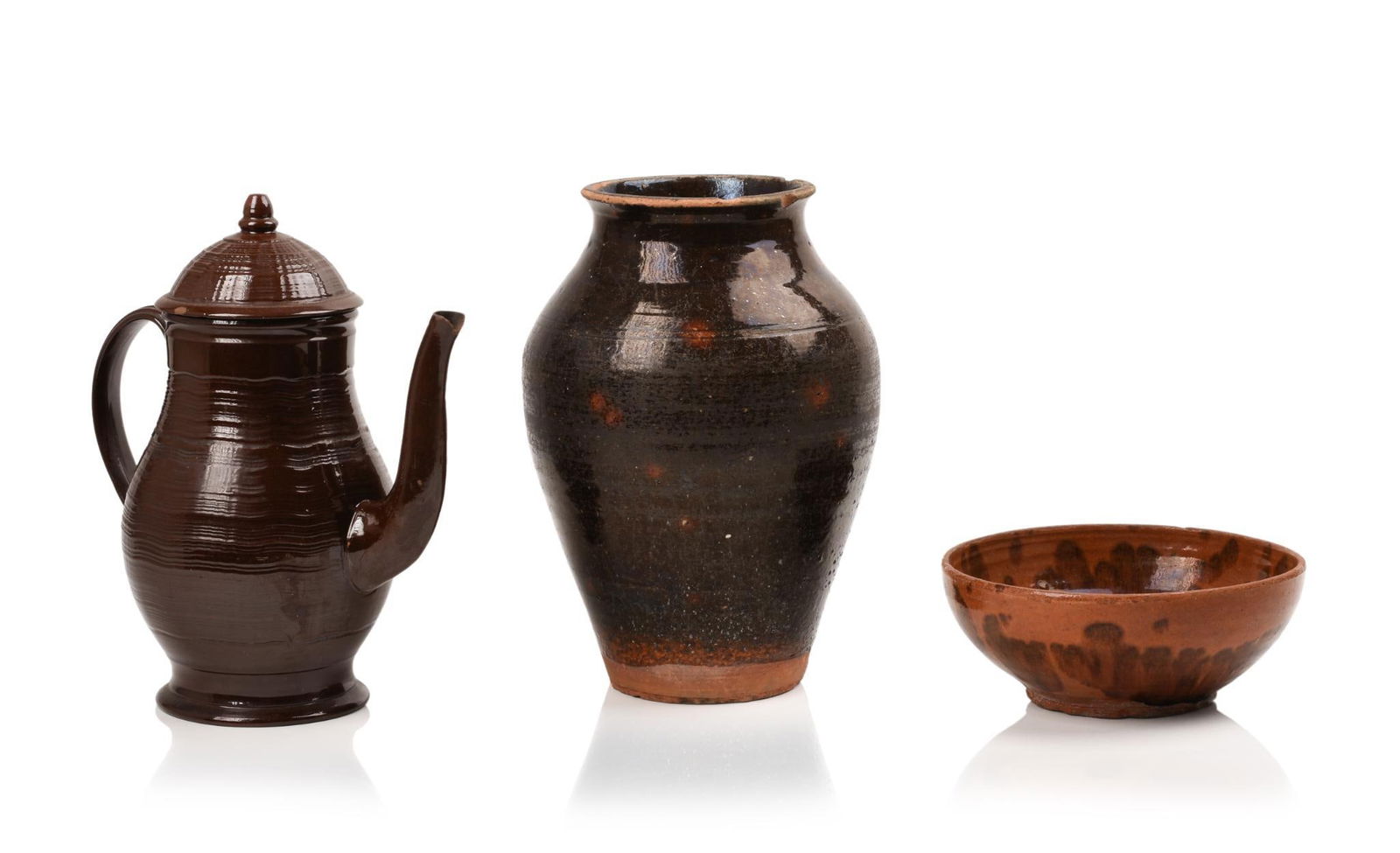 REDWARE JAR, BOWL AND TEAPOT.