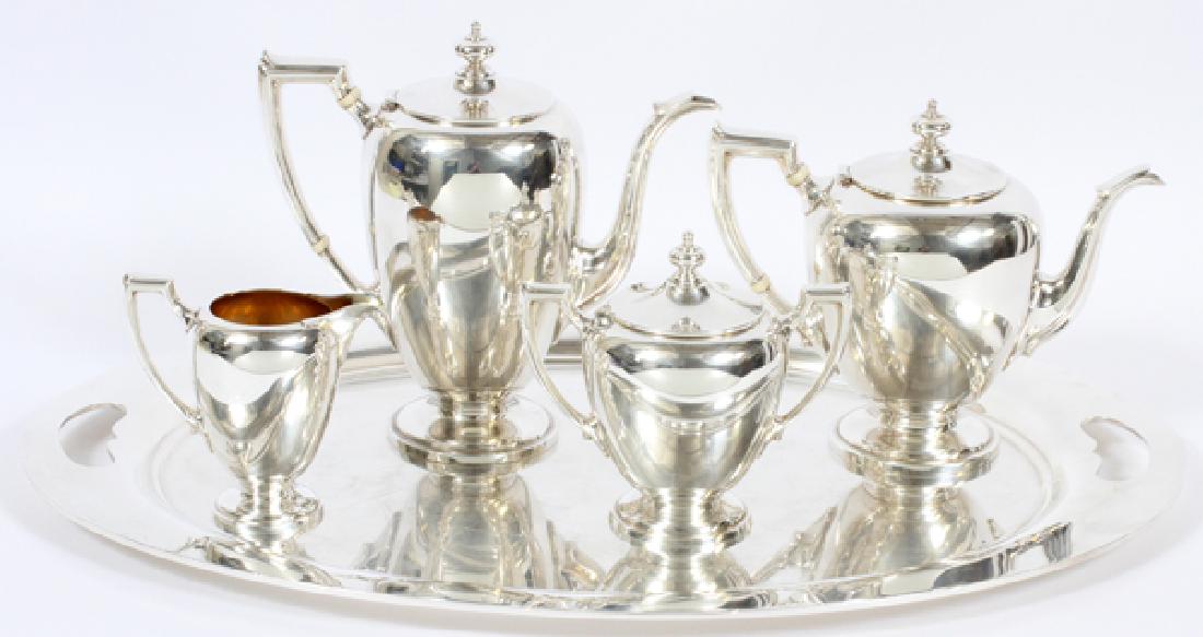 ENGLISH SILVER LUSTRE CERAMIC TEA AND COFFEE ARTICLES, LOT OF SIX7 days LeftSterling Silver Estate TablewaresMar 05, 2026A FOUR-PIECE SILVER 'BAMBOO' TEA AND COFFEE SERVICE, MARK OF ZEE WO, SHANGHAI, CIRCA 1870-1925Mar 11, 2026Sterling Coffee and Tea Set by Reed & BartonMar 10, 2026Gorham Sterling 5 Pc. Coffee and Tea SetMar 10, 2026Reed and Barton "Regent" Tea & Coffee Service Set (6)Mar 07, 20266PC STERLING TEA SERVICE, INTERNATIONAL, 133 TOWMar 07, 20266 Piece Sterling Silver Tea and Coffee Set18 hrs Left(4) PIECE ASSEMBLED STERLING TEA SERVICEMar 05, 20265 Pieces Preisner Sterling Silver Tea Set with a Large Oval English Sterling Silver Tray3 days LeftE.G. WEBSTER & SON SILVER-PLATED FIVE-PIECE COFFEE AND TEA SERVICE7 days LeftBailey, Banks & Biddle Queen Anne Sterling Tea Set2 days LeftLouvre Silver Shop Blossom Mexican Sterling Silver 6pc Tea Set2 days LeftAmerican Sterling Silver Tea ServiceMar 11, 2026Six-Piece Gorham Sterling Tea & Coffee Service20 hrs LeftReed & Barton, Etc. Silver Plate Tableware, 10 PcsMar 12, 2026