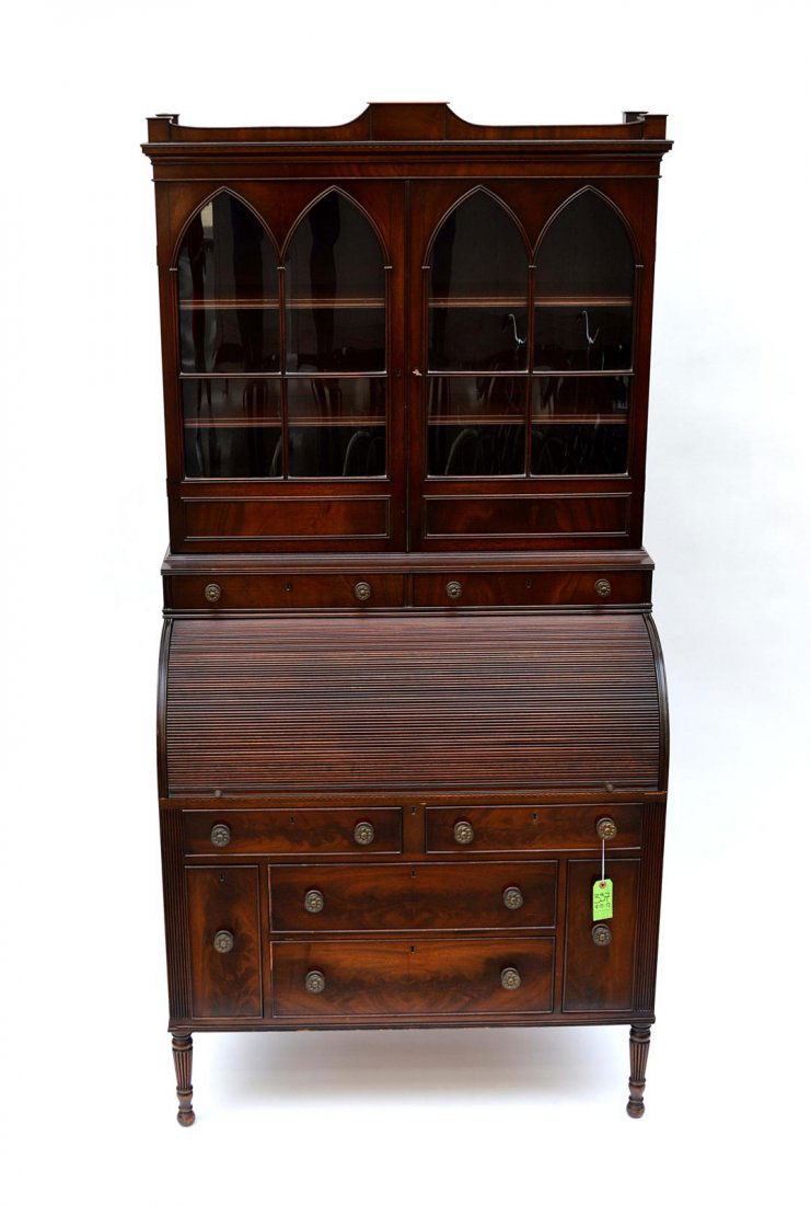 Sold19TH C. MAHOGANY CYLINDER SECRETARY BOOKCASEA nineteenth century four part mahogany two door cylinder secretary bookcase having Gothic style mullions and bronze mounts. Ht: 93" Wd: 48" Dpth: 25.5"See Sold Price