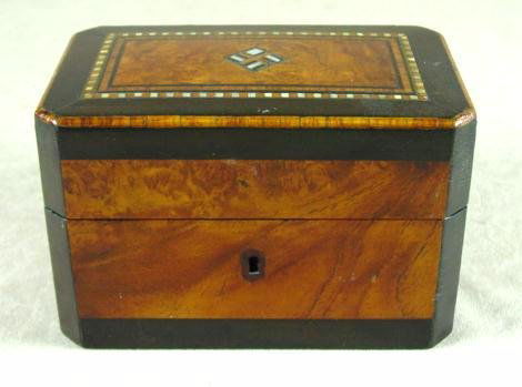 SoldTwo English Inlaid Table Boxes, Early 19th CenturyA Regency Mahogany Inlaid Burlwood Table Box, Early 19th Century Together with a similar rectangular inlaid mahogany tea caddy. (2) Dimensions: Height of larger 6 1/4in; width 9in; depth 8 1See Sold Price