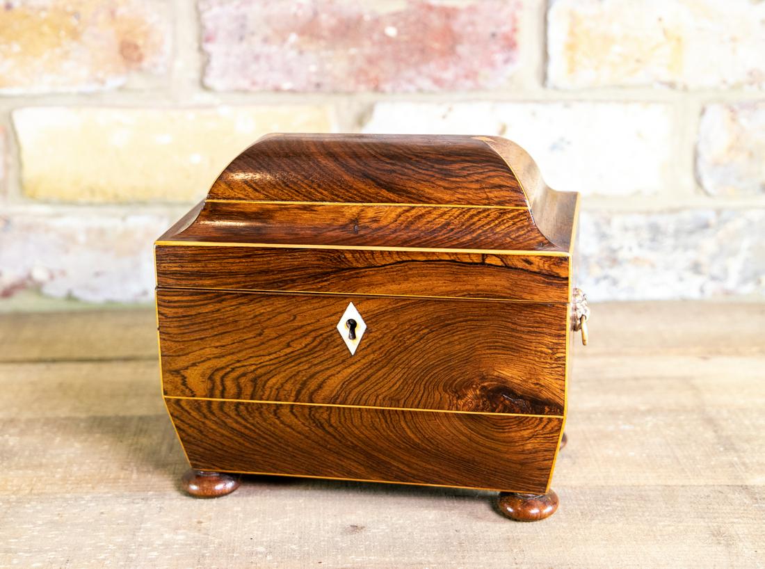 SoldRegency Rosewood Tea Caddy 1820Title: Regency Rosewood Tea Caddy 1820 Description: A delightful regency tea caddy made from rosewood in immaculate original condition. It sits on four brass feet. Being Regency it dates to c.1820-30,See Sold Price