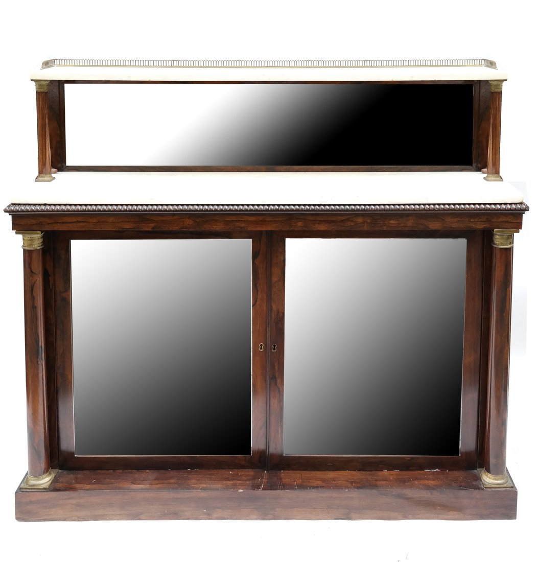 SoldANTIQUE REGENCY ROSEWOOD SERVERAn antique Regency Rosewood server having a three-quarter brass gallery above three shelves and mirrored back. Measures: 38½" L x 17¼" W x 50¼" H.See Sold Price