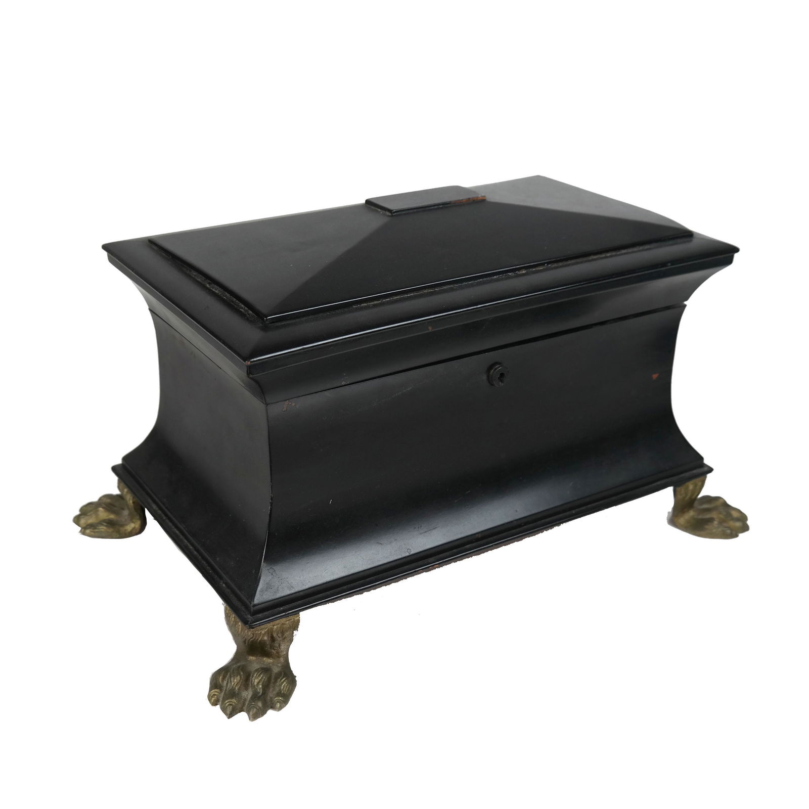 19TH CENTURY ENGLISH REGENCY MUSICAL TEA CADDY WITH MARQUETRY, INCLUDES JAR WITH STERLING SILVER ...METAL BALL FOOTED WITH HINGED TOP, TWO METAL LINED COMPARTMENTS FOR TEA EACH WITH MARQUETRY TOP, INCLUDES SMALL GLASS JAR WITH STERLING SILVER TOP AND STERLING SILVER SPOON FOR SUGAR, MARQUETRY ON TOP
