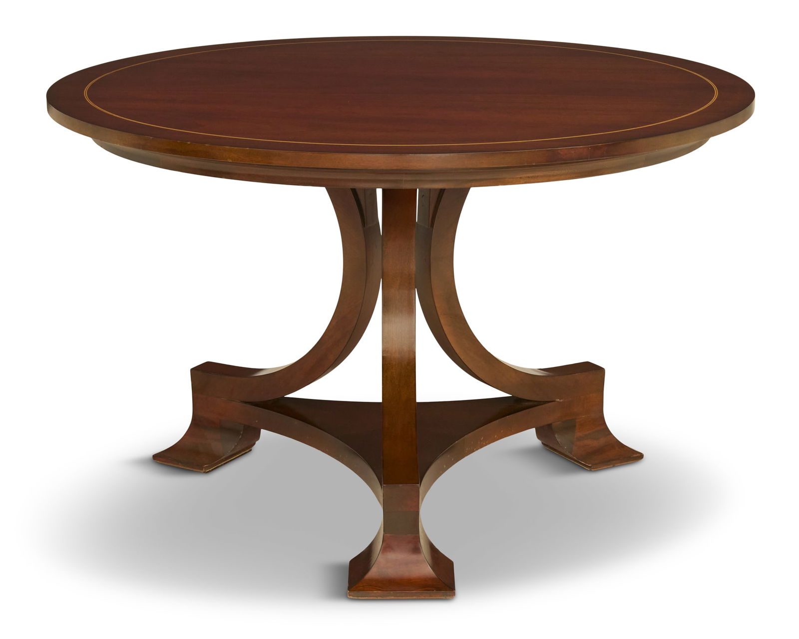 SoldCabinet-made Regency style mahogany center tableMcLean-Wiesand, Baltimore, 20th century; 47 3/4 in. Diam., round top with gold banding, pyramidal standard on shaped platform base, 30 1/2 in. H.See Sold Price