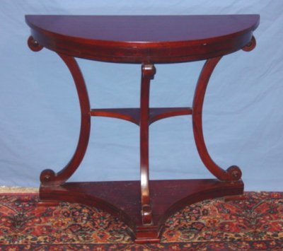 SoldCarved mahogany demilune Regency style console table,Carved mahogany demilune Regency style console table, w/drawer, 20th c, 44"w, 20 1/2" d, 36" hSee Sold Price