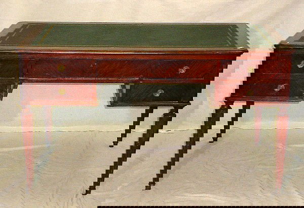 SoldREGENCY STYLE WRITING DESK INSET LEATHER TOPA mahogany Regency style writing desk having inset leather top over drawers all supported on tapered legs. Ht: 28.5" Width: 54" Dp: 37.75"See Sold Price