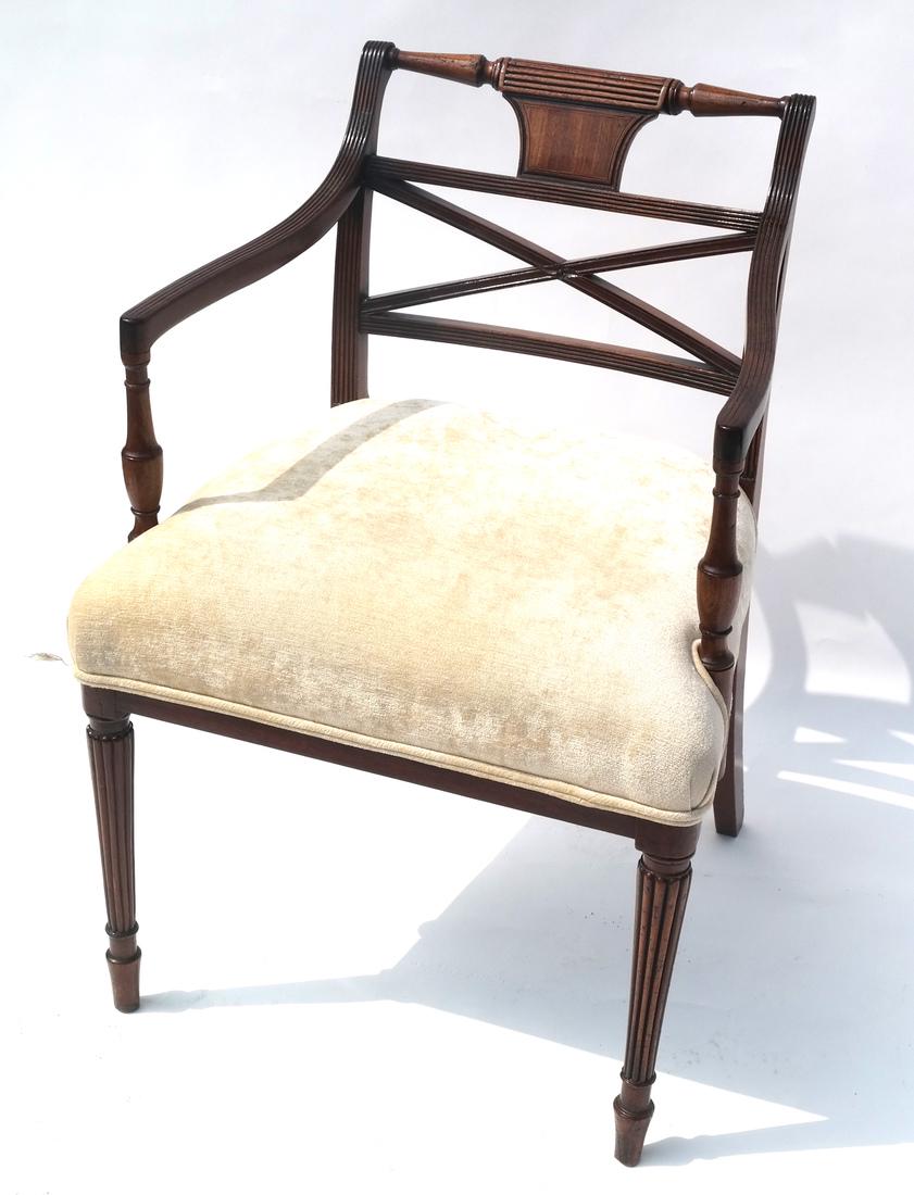 SoldRegency Style Open Arm ChairA Regency style open arm dining chair. Early 20th Century. Mahogany and blue upholstered cushion. With Guy Eklund Inc. tag. Some scratches on top rail. 35 1/2" H x 22 1/2" L x 22" D.See Sold Price