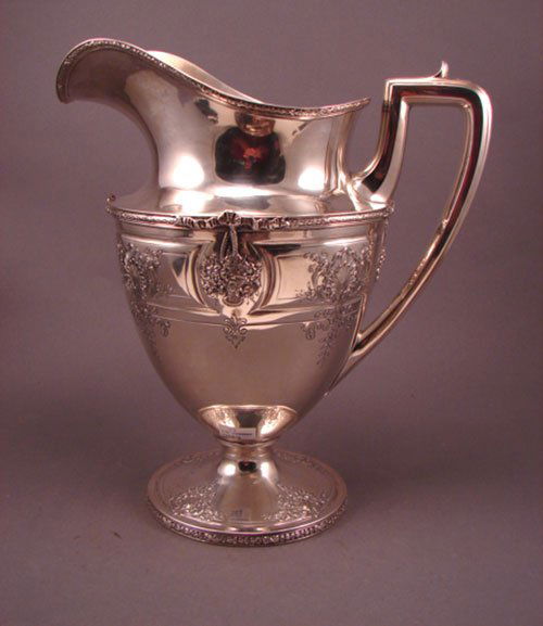 SoldGorham Sterling Silver Water PitcherGorham Georgian-style sterling silver water pitcher with flowers and scroll handle, size A573, holding 4.5 pints, with monogram. 31.6 ozt. [12" H x 8" W x 6" D].See Sold Price