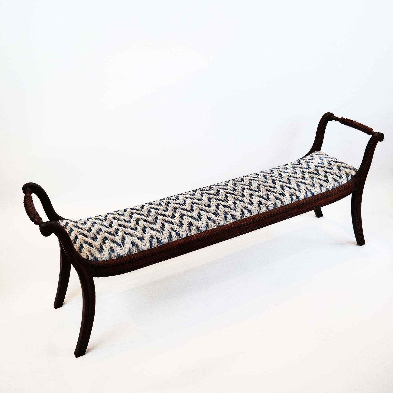 SoldESTATE OF DENNIS P. RODANO SR.: REGENCY STYLE MAHOGANY WINDOW BENCH 23" X 53" X 16 1/2"This elegant Regency-style mahogany window bench offers a stylish and functional seating option. The bench features a curved backrest, scrolled arms, and tapered, fluted legs, all characteristic of thSee Sold Price