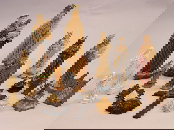 Religous figures in gilt, metal, ceramic