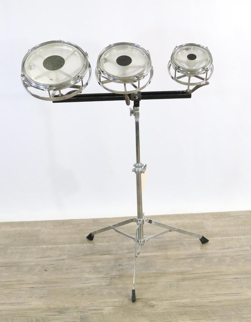 SoldREMO ROTO TOM DRUM SET WITH THREE SIZES & STANDREMO ROTO TOM DRUM SET WITH THREE SIZES INCLUDING 6", 8", AND 10" MOUNTED ON A SINGLE ADJUSTABLE BAR WITH HEAVY DUTY TRIPOD STAND. FEATURES REMO PINSTRIPE DRUMHEADS AND EASILY TUNABLE DESIGN BY ROTATISee Sold Price