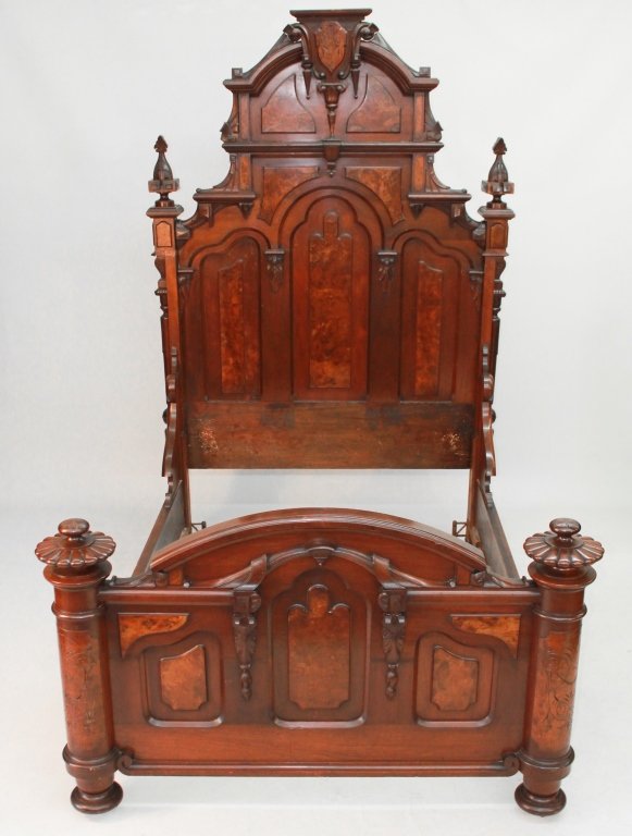 SoldA FINE AMERICAN WALNUT RENAISSANCE REVIVAL BEDThe high arched headboard surmounted by an arched pediment with an elaborate cabochon shield over triple arched recessed molded panels with burled wood panel spandrels centering a carved rosette and cSee Sold Price