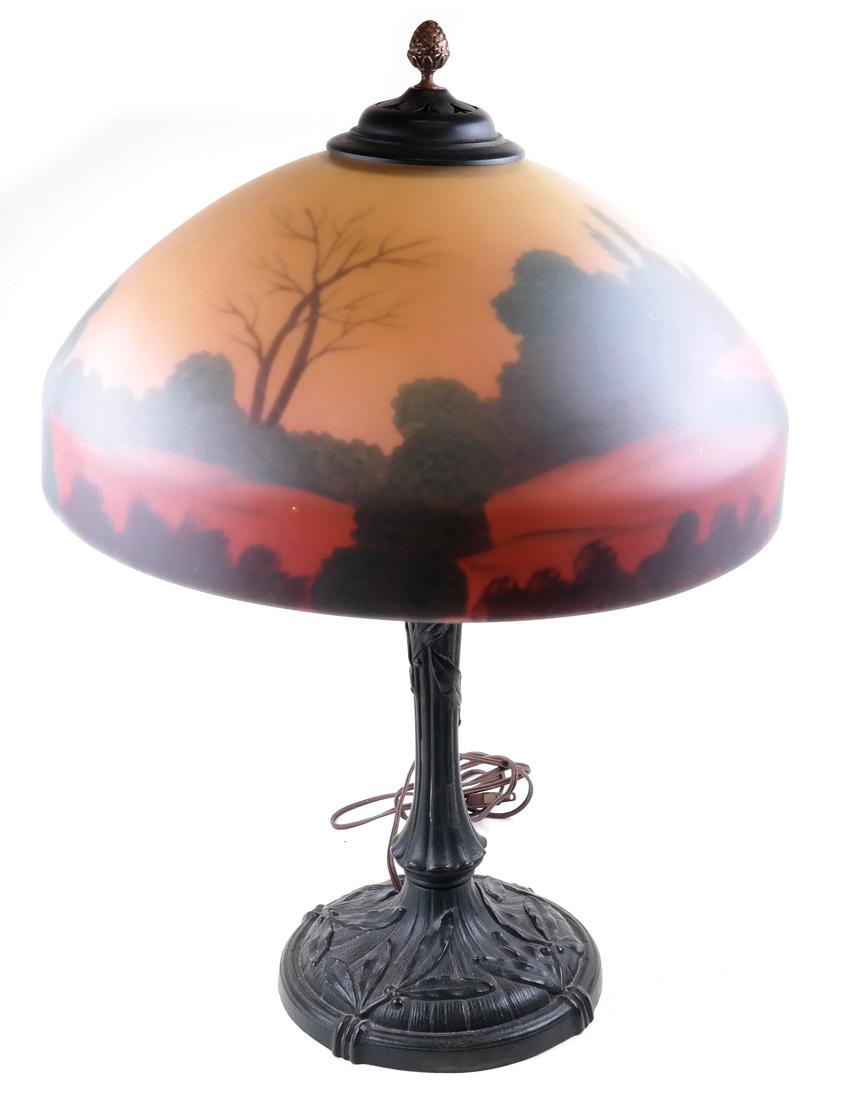 SoldREVERSE PAINTED GLASS TABLE LAMP, SIGNEDPITTSBURG BASE, LANDSCAPE SHADE, 20 1/2" H, 16" DIA.See Sold Price