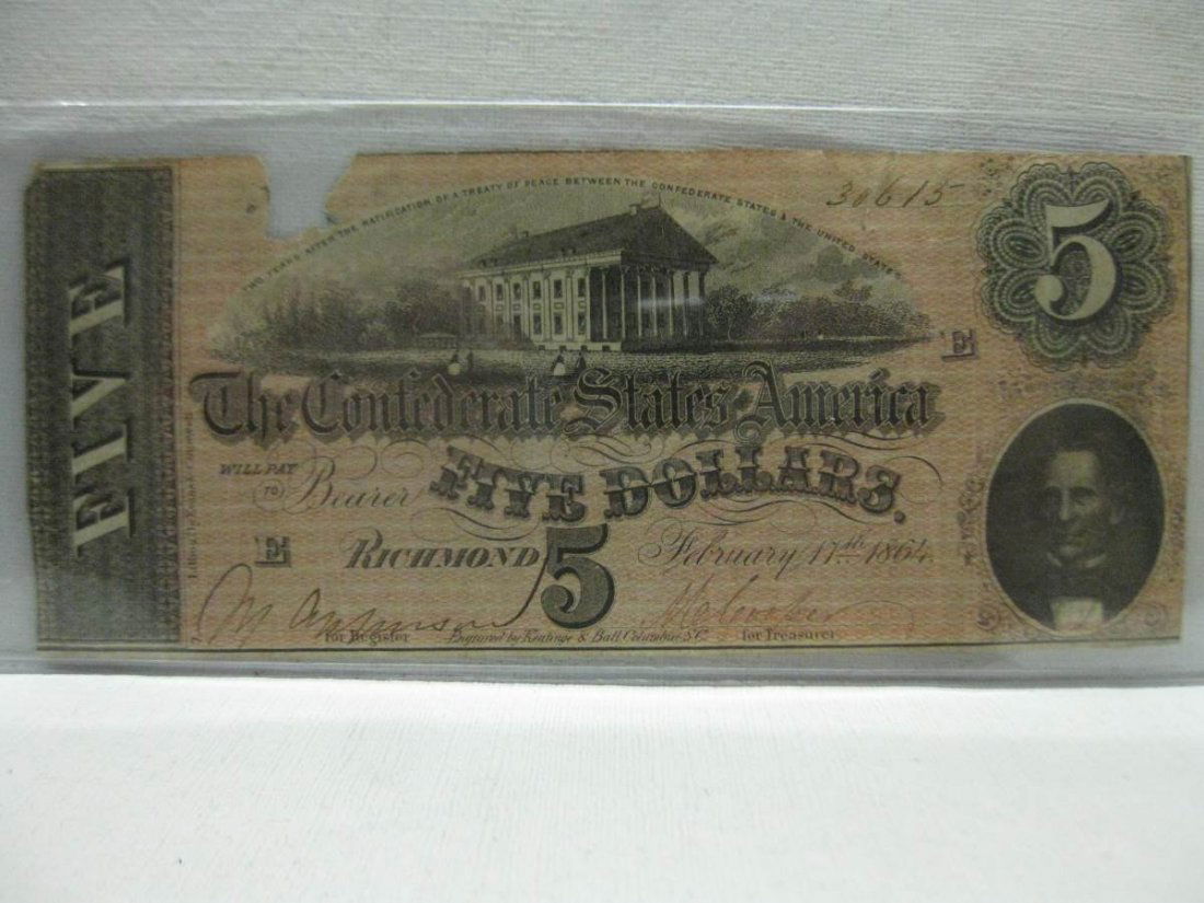 CONFEDERATE STATES CIVIL WAR $5 OBSOLETE CURRENCY / NOTES, LOT OF 12382 Lots AwayCONFEDERATE STATES CIVIL WAR $100 OBSOLETE CURRENCY / NOTES, LOT OF TWO376 Lots AwayCONFEDERATE STATES CIVIL WAR $500 OBSOLETE CURRENCY / NOTE375 Lots AwayConfederate States 1862 Fifty Dollar Note PMG VF30 Certified7 days LeftConfederate States 1863 Five Dollar T-60 Note PMG VF25 CertifiedMar 15, 2026Confederate States of America $50 Jefferson Davis Note T-52 1862 Civil War CurrencyMar 15, 2026Confederate 1864 Fifty Dollar T-66 PMG AU58 EPQ Certified Note4 days LeftScarce Confederate States of America One Hundred Dollar Train Note. This Note features a train and aMar 28, 2026T-66 Confederate $50 Note 1864 PMG VF30 CertifiedMar 15, 2026Confederate States 1861 Fifty Dollar T-16 Note PMG VF25 GradedMar 14, 2026Confederate Notes - T-68 1864 $10 CSA PCGS Choice UNC63Mar 18, 2026Confederate States of America. Group of Three [3] One, Five and Fifty Dollars Banknotes.5 days LeftConfederate States of America, Five Dollars T36.5 days LeftConfederate States 1861 One Hundred Dollar T-5 Note PMG F15 CertifiedMar 14, 2026Confederate States 1861 Ten Dollar Note PMG VF20 CertifiedMar 14, 2026CU63 1864 $5 Confederate States of America T-69 CSA PMGMar 20, 2026