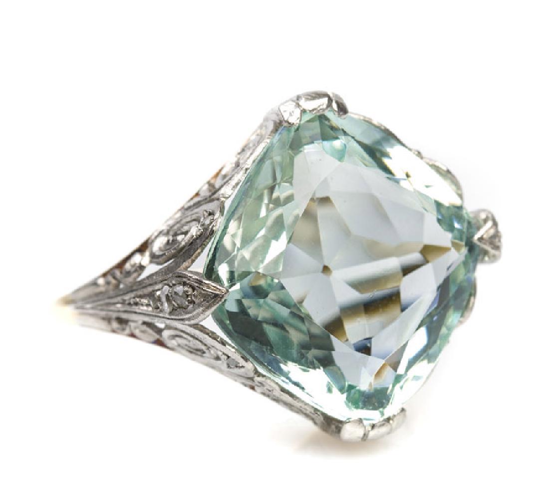 Art Deco Platinum Ring 34.50 Ct Aquamarine & 30 Diamonds