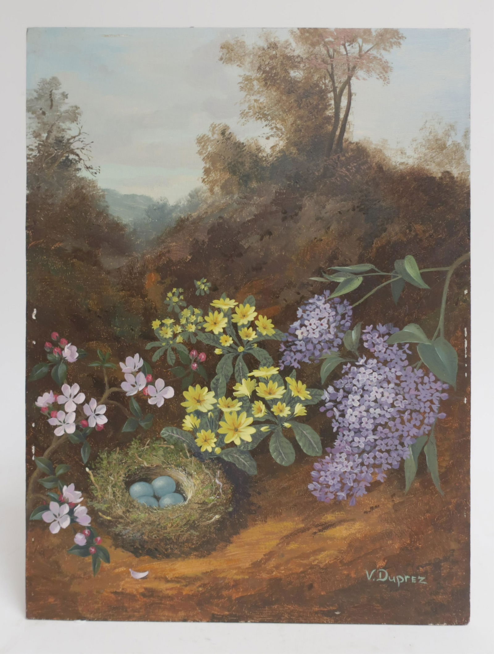 Robin's Eggs in Nest, signed V.Duprez,O/B