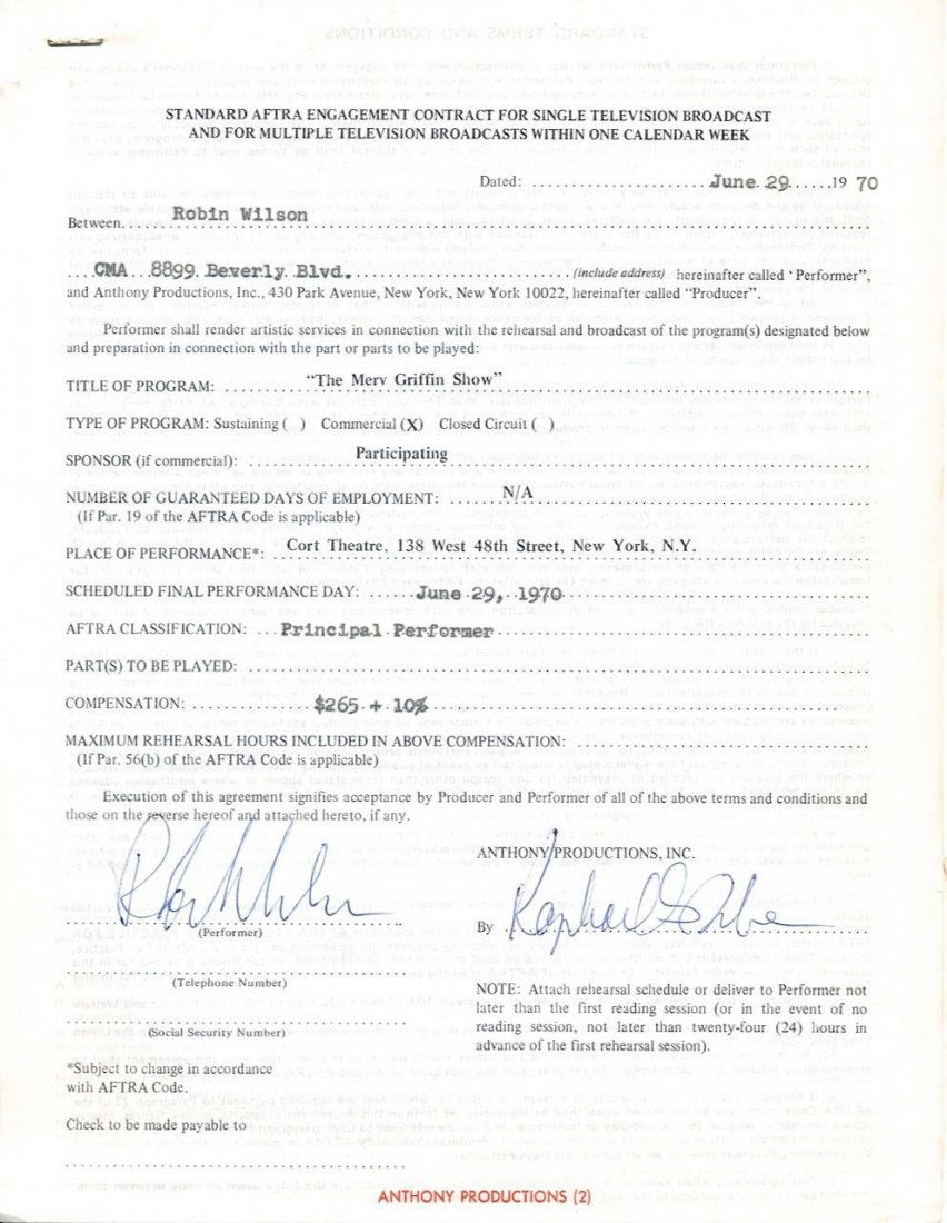 Robin Wilson Signed 1970 Merv Griffin Contract