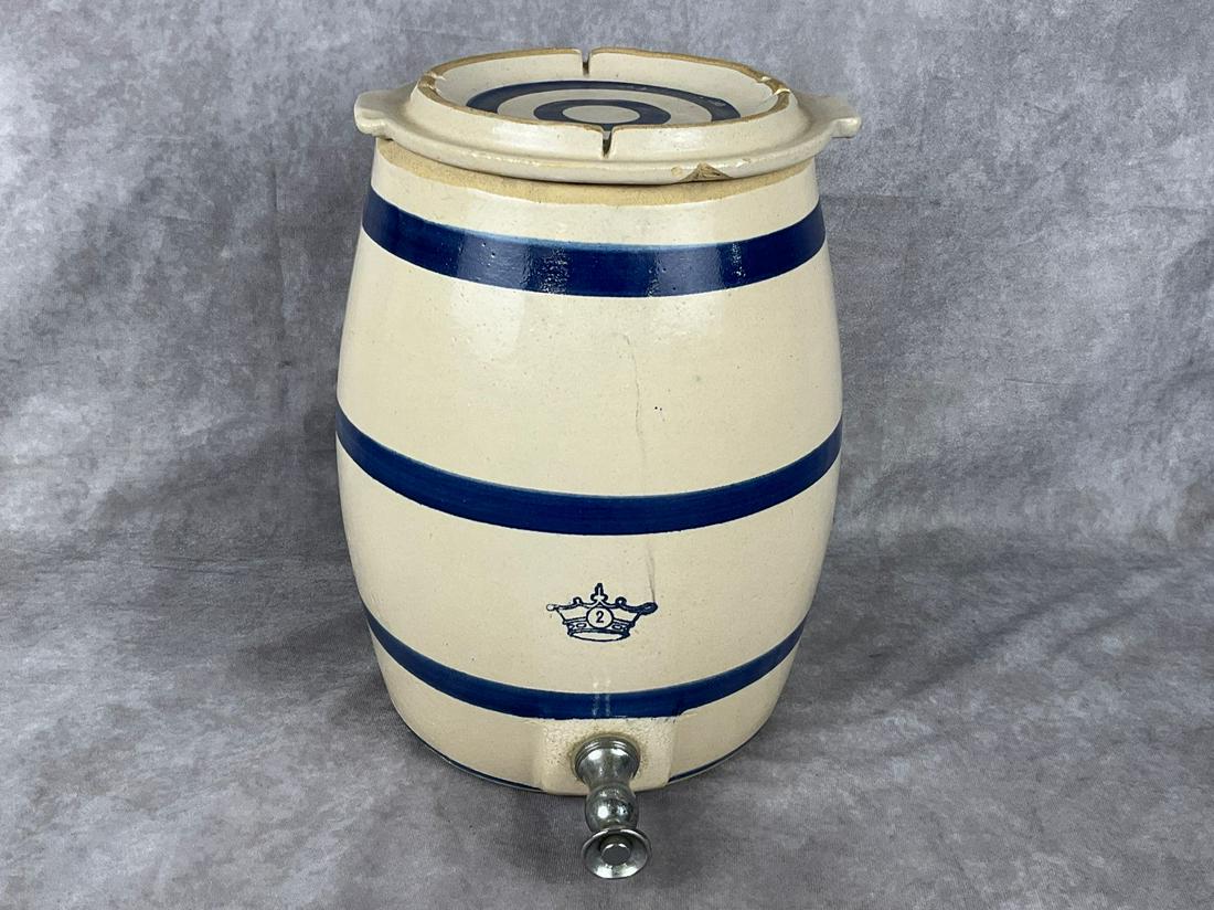 Red Wing 5 Gallon Water Cooler bar handled lid w/petals & blue bands, incised 5W, (fits 6 gal coo...The Indian Head Wine & Liquor Co. N.W.T. 1/2 Gal JugRed Wing Union Stoneware 6 Gallon Water Cooler, large wing, handwritten 6 on bottom interior, app...Red Wing 2 Gallon Water Cooler w/wire handles & spigot, small wing, RARE upside down RW Union Sto...Western Stoneware Cupid 6 Gallon Water Cooler w/orig lid, embossed 6 near base on front, factory ...Red Wing 5 Gallon Leaf Crock, chip on one handle/hairline crack on factory glaze imperfection, o/...Minnesota Stoneware 1 Gallon Salt Glaze Crock w/Lid, embossed bottom reads "Minnesota Stoneware C...Red Wing Birch Leaf 3 Gallon Butter Churn w/ski oval & lid, lid impressed w/6, slight hairline cr...JB Cole Pottery Cookie JarFeb 21, 2026Advertising Pickle Barrel Crock w/wooden lid, stamped Dodson & Braun's Fine Pickles St. Louis, ha...Western Stoneware Butter Crock, embossed Western Stoneware Co. Plant 5 LB on bottom & 5 on lid bo...2 Gal. Cobalt Blue Crown Banded Lidded Stoneware Crock DispenserMar 02, 2026Red Wing 15 Gallon Crock w/large wing & Union Stoneware Co. oval, small factory glaze imperfectionsAntique Barrel Butter Churn w/Cast Iron HardwareMar 07, 2026Antique 5 Gallon Stoneware Crock3 days LeftVintage Stoneware Mini PitcherFeb 17, 2026