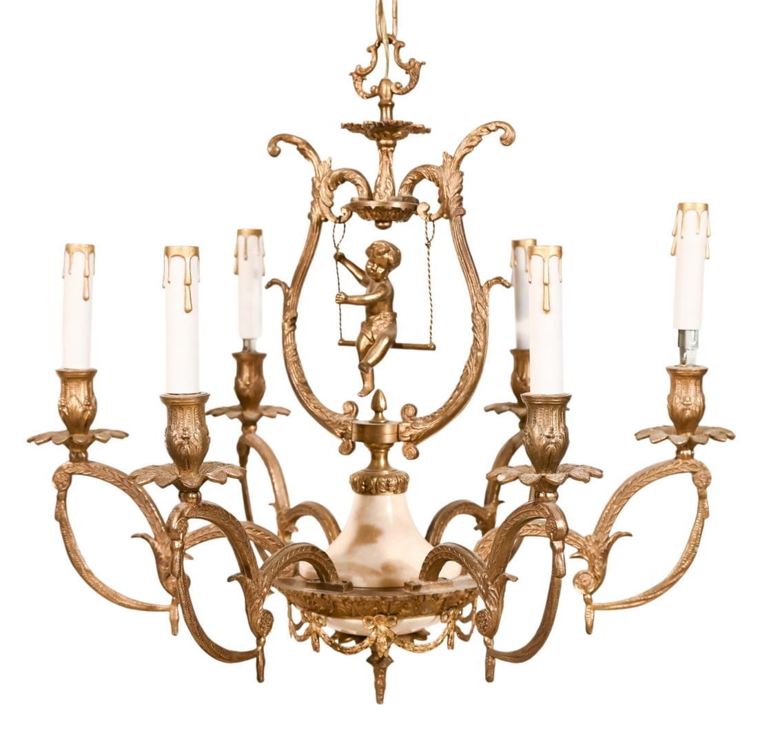 Rococo Style Brass Marble 6 Light Chandelier