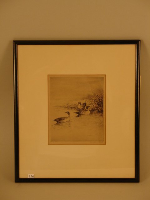 ROLAND CLARK ETCHING, 3 PINTAILS IN WEEDS