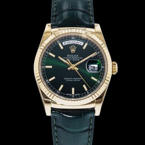 SoldROLEX COSMOGRAPH DAYTONA GREEN DIAL 116508Rolex Day-Date 36 Green Dial Solid 18K Gold Watch 118238With Manufacturer Serial Numbers- Swiss Made- Green Dial- Index Hour Markers- Polished Solid 18k Yellow Gold Fluted Bezel- Day and Cyclops LensSee Sold Price