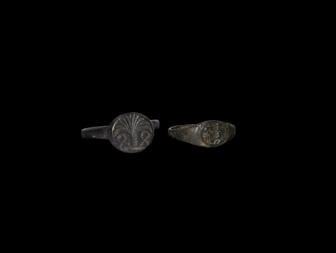 SoldRoman Bronze Ring Bezel Group1st century B.C.-1st century A.D.. Comprising: vesica-shaped bezel with incise togate standing figure with sceptre; ellipsoid bezel with profile bust. 4.51 grams total, 20-21 mm (3/4 in.). Property ofSee Sold Price