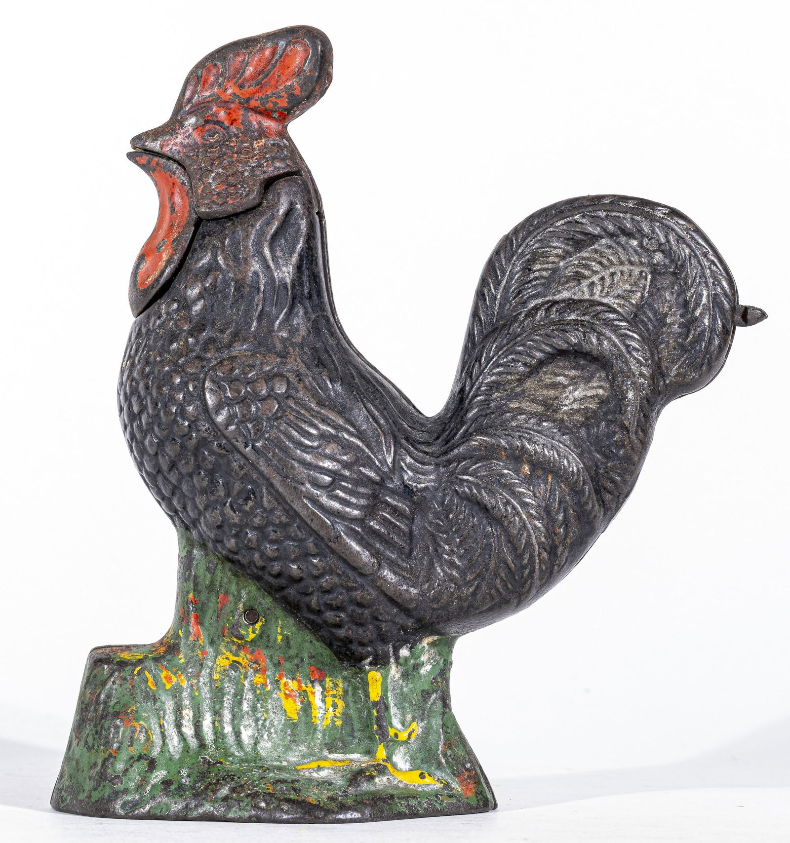 SoldCast Iron Mechanical Rooster BankMulti color mechanical cast iron rooster bank by Kessler & Rex circa 1890. Bank is in good condition. Mechanics are working. Bid with confidence and See pictures for condition. If bidding online feelSee Sold Price