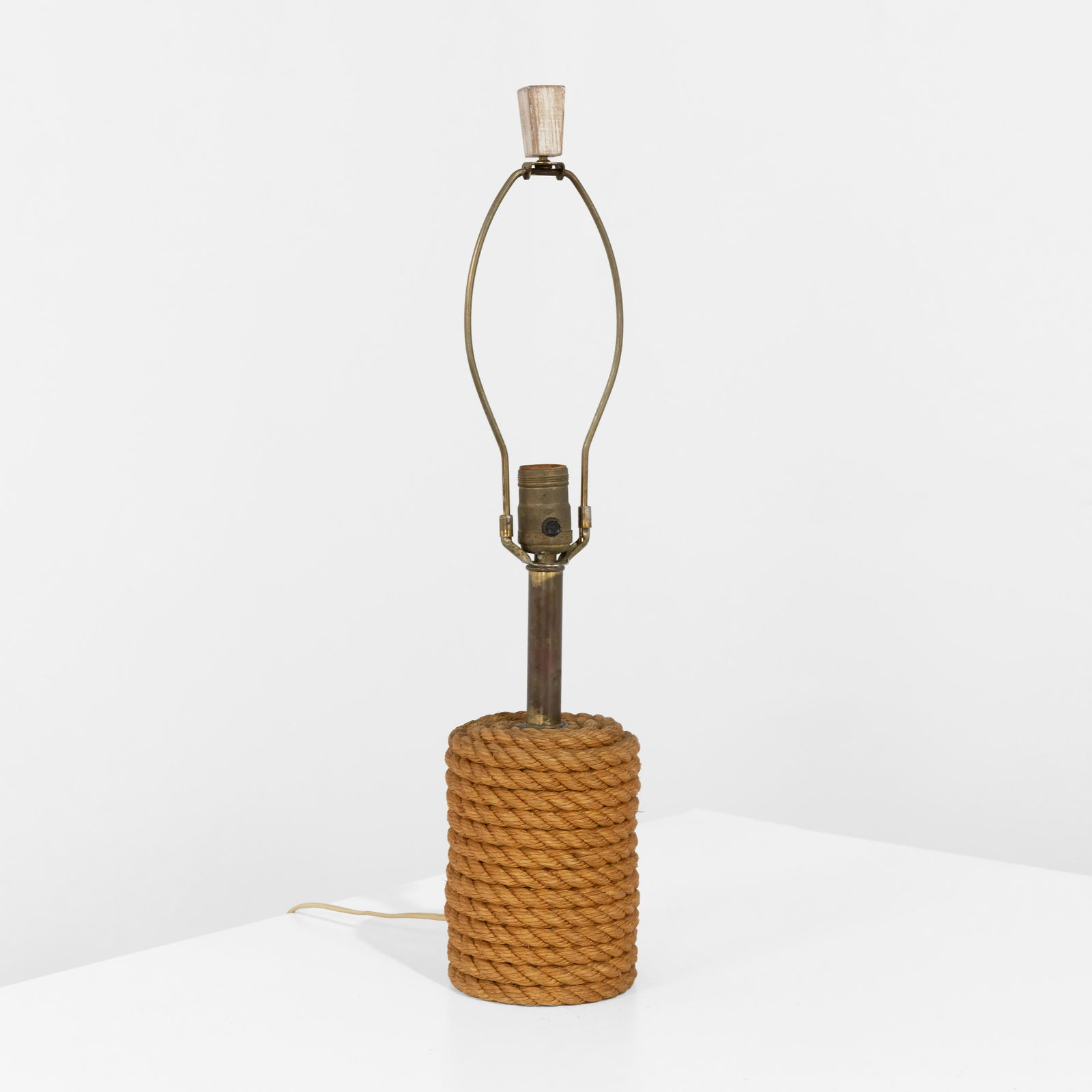SoldRope Pendant Lamp, Style of Audoux & MinetMid-century Modern Nautical Rope Pendant Lamp, Style of Audoux & Minet. A playful nautical hanging light fixture composed of a simple hemp rope loop and brass hardware. No labels, but in the manner ofSee Sold Price