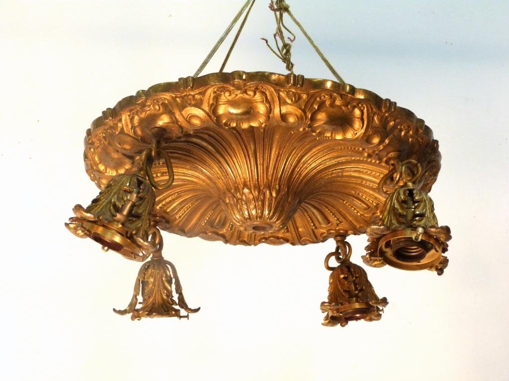 Sold2 Brass Chandeliers & 1 Bronze Ceiling Fixture2 French brass chandeliers and 1 gilt bronze ceiling fixture. 1 basket form, the other Empire 4-light. Larger approx. 35" H x 14" diameter. (PF280, 051302B)See Sold Price
