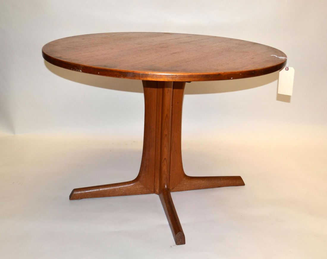 SoldRound Mid Century Modern Dining Table - McIntoshRound Danish Modern Style Dining Table by McIntosh - 30 in tall x 48 inch diameter, Leaf adds an additional 18 inches, Floor to apron is 26.5 inches and the space between the legs is 29 inchesSee Sold Price