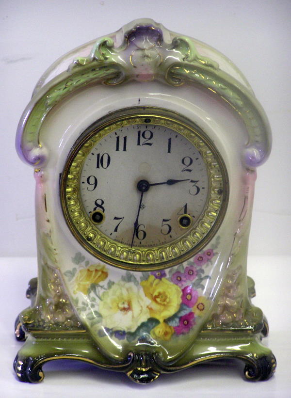 SoldPorcelain Ansonia Clock w/ Floral Motif.The clock's Working condition is Unknown. The dial is marked as Ansonia, made in New York. The back of the porcelain body is stamped, "Royal Bonn Germany". Cosmetically, it is in overall Good conditioSee Sold Price