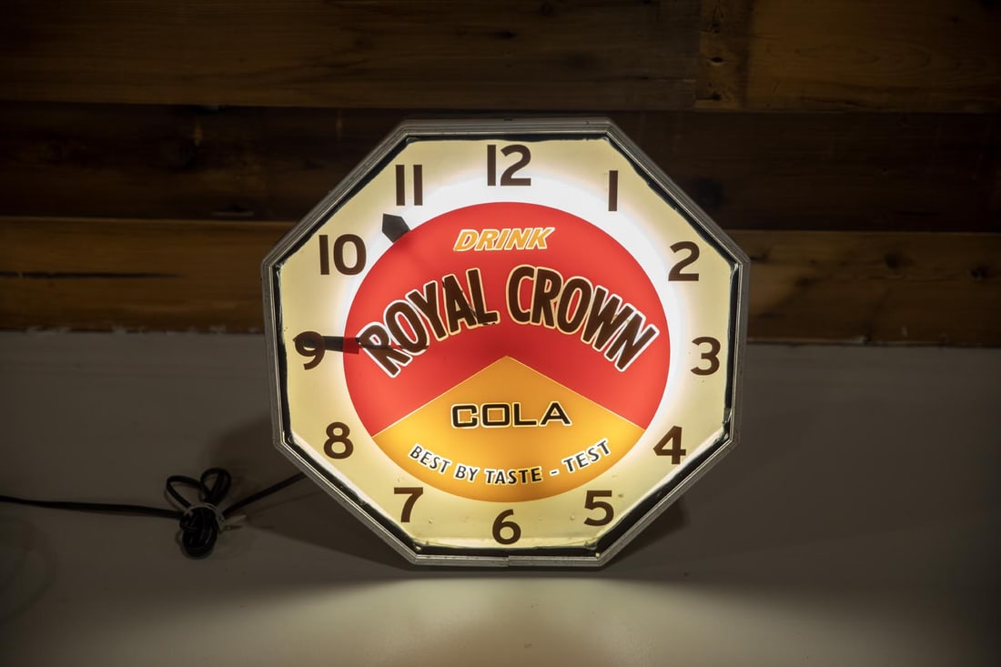 Large 4' Foot Coca-Cola Light Up Steel Marquee Clock, Circa 1960Royal Crown Cola Double Sided Tin SignMar 20, 2026Pepsi Cola double bubble lighted clockMar 28, 2026Rare Vintage Royal Crown Cola Thermometer 12"Mar 14, 2026Coca Cola bubble lighted clockMar 28, 2026Royal Crown Cola SignMar 28, 2026Pepsi Cola Light Up Clock With Bottle CapMar 20, 2026Royal Crown Cola Die-Cut Painted Metal Hanger Sign W/ Bottle GraphicMar 25, 2026Drink Coca-Cola Electric Clock 15"Mar 14, 2026Drink Royal Crown Cola Best by Taste Steel Advertising SignMar 14, 2026Drink Coca-Cola Electric Advertising ClockMar 14, 2026Coca Cola bubble electric clockMar 28, 2026RC Cola Single-Sided Embossed Tin Sign W/ Crown GraphicMar 25, 2026Be Sociable, Have A Pepsi double bubble clockMar 28, 2026Drink Sun Crest Beverages Electric Clock 16"Mar 14, 2026Royal Crown Cola Metal Advertising SignMar 14, 2026