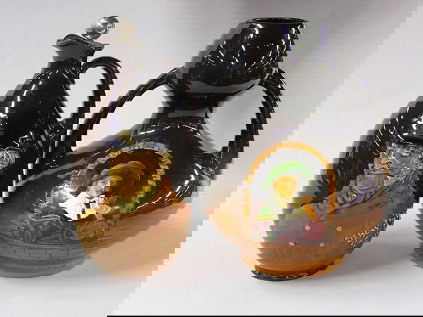 Sold5 pieces5 pieces; 2 Royal Doulton decanters (one stopper damage, 10.5"H each) and 2 vintage hand painted Nippon creamer (3.75"Hx4.6"x3.25") and sugar (4.6"Hx5.9"x3.9") set, and a framed miniature watercolor pSee Sold Price