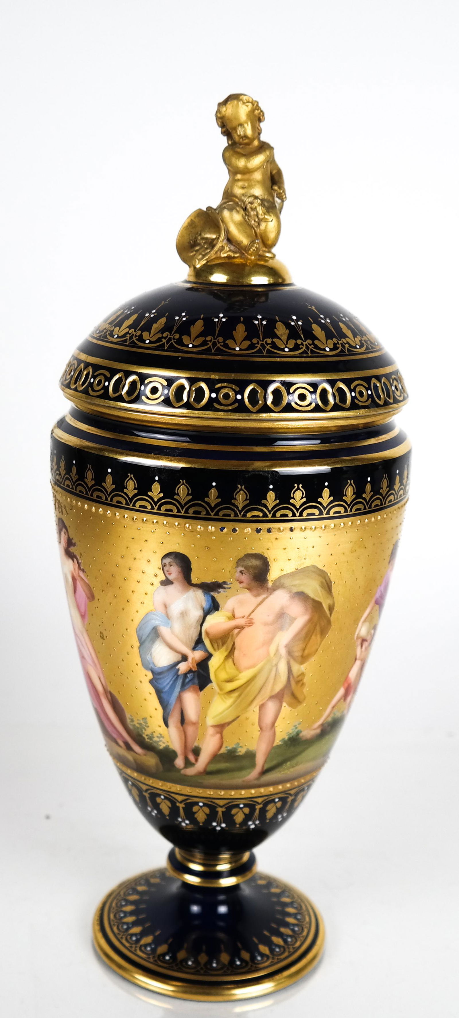 SoldRoyal Vienna Porcelain Covered UrnRoyal Vienna Porcelain Covered Urnlate 19th centuryeach side decorated with Greek mythological scenes, the underside with blue beehive mark14 in. highSee Sold Price