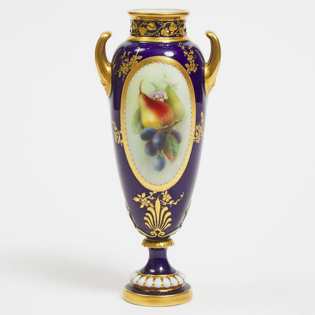 Royal Worcester Blue Ground Fruit Painted Two-Handled Vase,