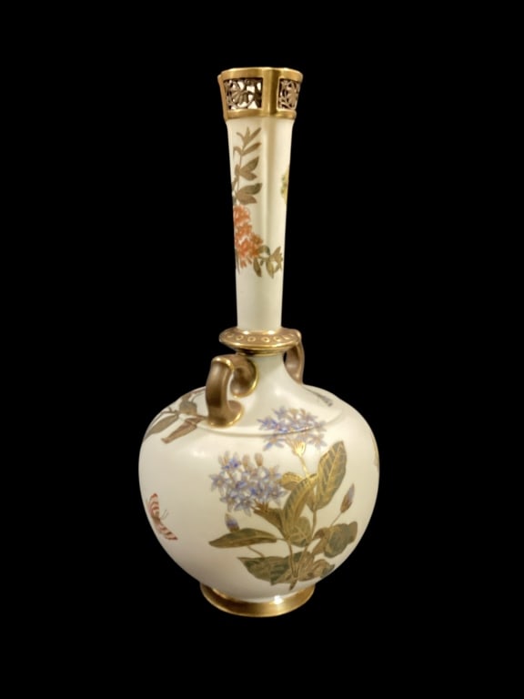 SoldPAIR OF 19TH CENTURY ROYAL WORCESTER VASESHand painted Royal Worcester vase with reticulated top and gold handles. 11.5" and a tall double handle reticulated gold floral design vase 14.5" with a stress crack on base.See Sold Price