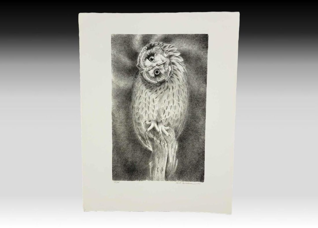 R.T. Wallen "Turned Head Owl" Stone Lithograph