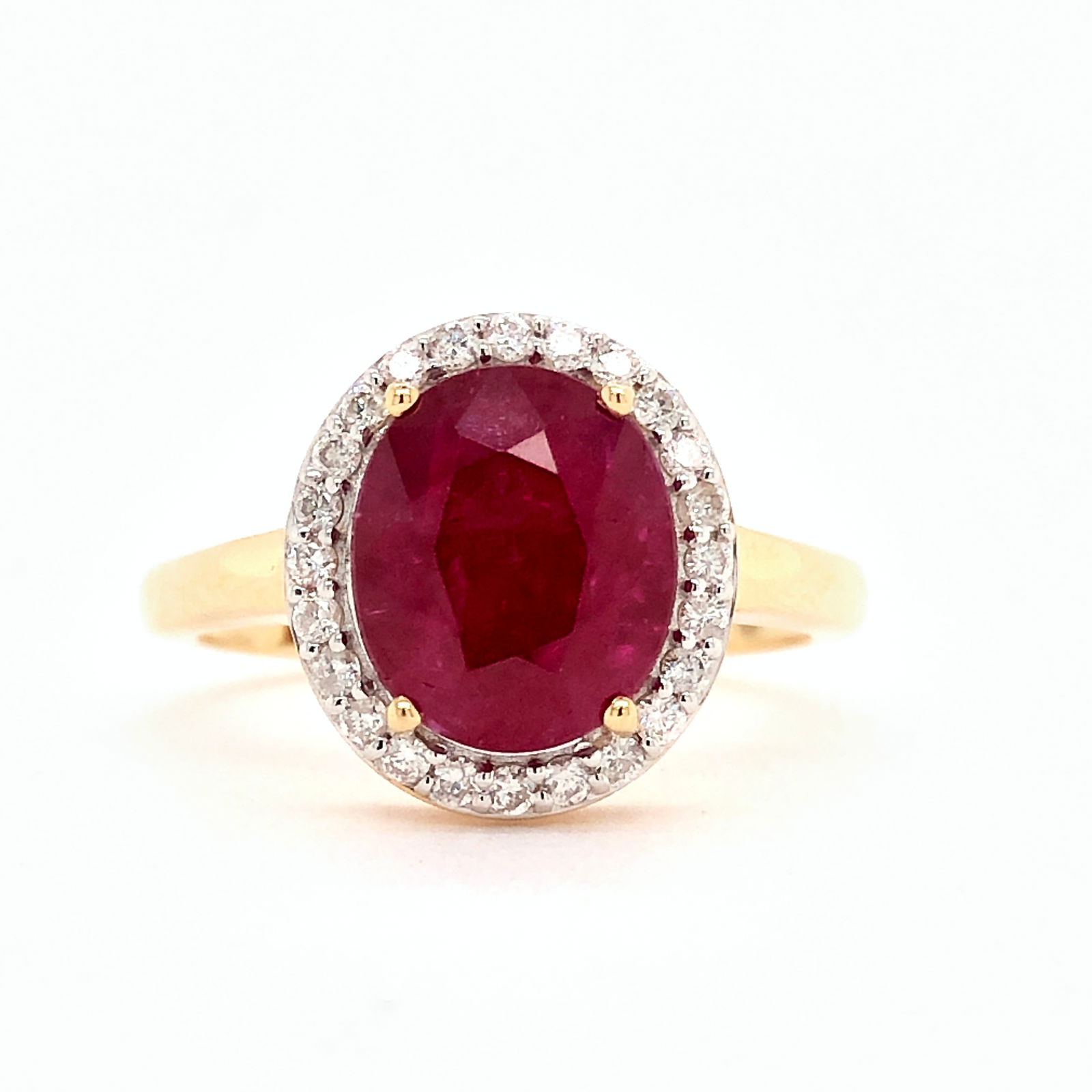 Statement Ring with Oval Ruby and Diamond Halo in 18K Yellow Gold 5.6g
