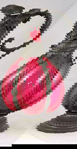 SoldEarly Hand Blown Metal Mounted Glass EwerEarly Hand Blown Metal Mounted Glass Ewer. Used condition, wear, worn, Metal losses. 7" tall x 4" wide.See Sold Price