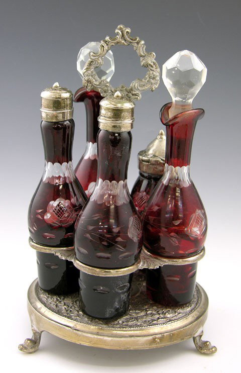 Ruby Cut-to-Clear Glass Five Bottle Cruet Set, ear