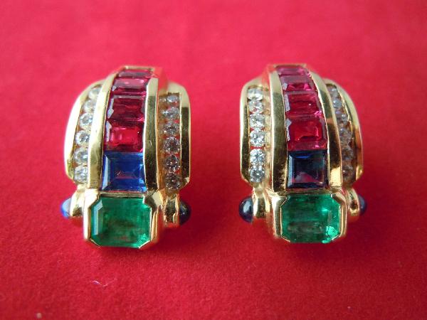 Sold18K Diamond Emerald Sapphire & Ruby Earclips18K Diamond Emerald Sapphire & Ruby Earclips. Size .75" L; weight 9.51 dwts.See Sold Price