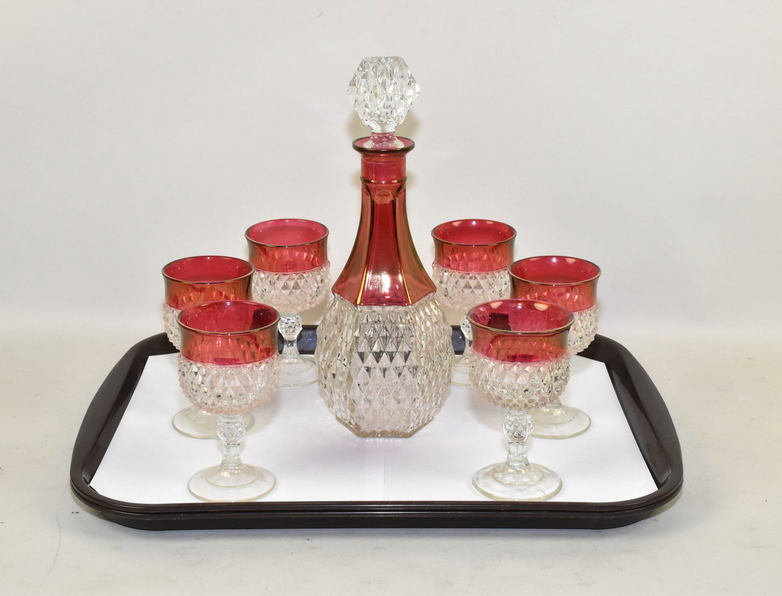 Tray Ruby Glass - Vase 9", 6- Cordials 3 1/2" + Ruby Flash Decanter 8"Apr 11, 2026Vintage Indiana glass diamond point ruby flash ice bucket(10.5in tall)5 days Left(5pc) Antique Cut Crystal Decanter & Tumbler SetApr 14, 2026(6pc) Antique Cut Crystal Decanter & Tumbler SetApr 14, 2026(3 pcs) Crystal Decanter & Cordial Glasses Set3 days LeftAntique Silver Overlay & Ruby Red Glass DecanterApr 14, 2026Bohemian Ruby Flash and Ducks Cut Glass DecanterApr 16, 2026A Vintage Bohemian Gilt Enameled Ruby Art Glass Liquor SetApr 11, 202619th C. Persian Qajar Bohemian Ruby Cut-Glass Decanter7 days LeftVintage Imperial Marigold Carnival Glass DecanterApr 20, 202619th Century Bohemian Emerald Green Glass Decanter SetApr 11, 2026(8 pcs) Austrian Gilt Plated Secessionist Glass Decanter SetApr 14, 2026A LALIQUE Femmes Crystal Set of Decanter & Tumblers, Signed7 days LeftAttrib. to Saint Louis Glass Decanter & Glass SetApr 22, 2026Decanter Set, American Brilliant Cut Glass, Hollow Diamond PatternMay 02, 202619th Century Moser Glass Crystal Liquor Set (8 Pieces)14 hrs Left
