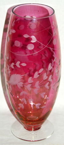 SoldEtched Cut Vintage Cranberry Glass Vaseglass crystal vase, bowl, vessel, in deep ruby red cranberry tones with etched cut crystal floral and vertical design elements, measures ht 4 inches diameter app 7 inches, appears good conditionSee Sold Price