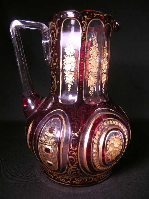 RUBY GLASS CUT TO CLEAR GILT DECORATED PITCHER