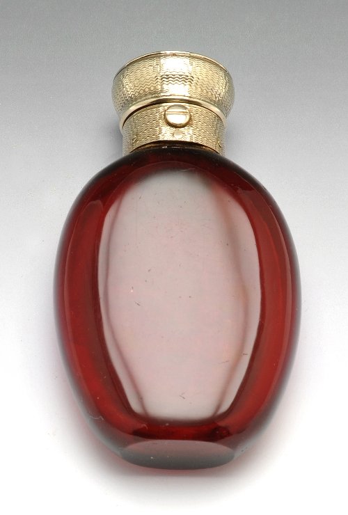Ruby glass scent bottle with gold coloured mount.