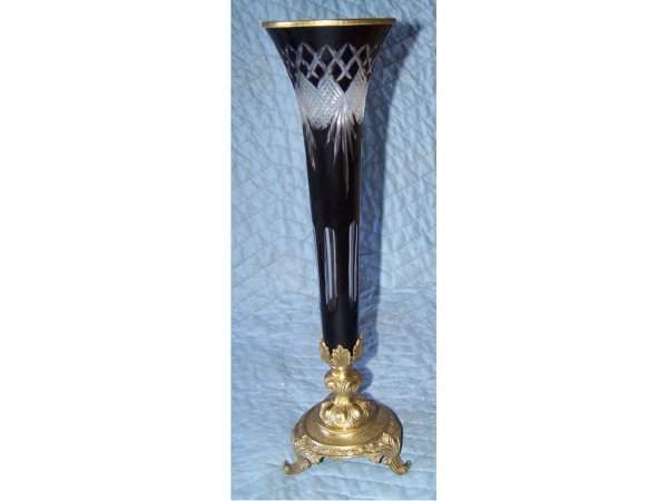 SoldAntique Bohemian Cut Crystal Centerpiece Footed VaseGorgeous large two handled vase in cobalt ruby red and clear glass with gilded floral decorations and ormolu bronze accents. Dimensions: 14"L x 24"H x 11"Dia.See Sold Price