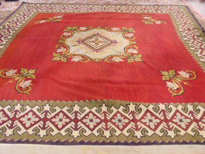 SoldHand Woven Soumak Room Size Rug, Approx. 9' x 12'Wool. China. Bold Geometric design on rose field. Gold, cream and green accent colors. Measures approximately 9' x 12'.See Sold Price