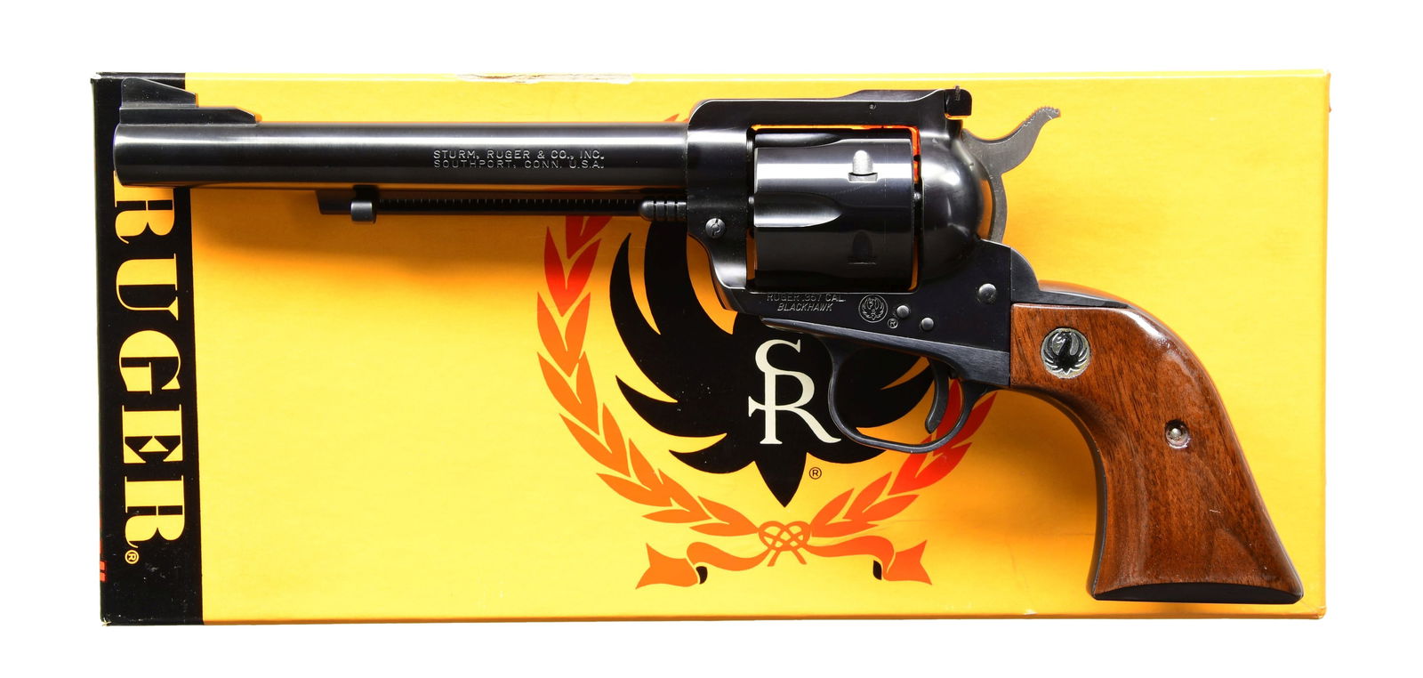 RUGER BOXED OLD MODEL 357 BLACKHAWK REVOLVER.