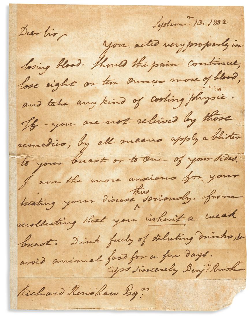 RUSH, BENJAMIN. Autograph Letter Signed, "Benj'n Rush,"