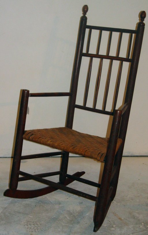SoldEarly Ladder Back Rocker Has acorn finials, 5 ladders,Has acorn finials, 5 ladders, a rush seat and delicate arms.See Sold Price